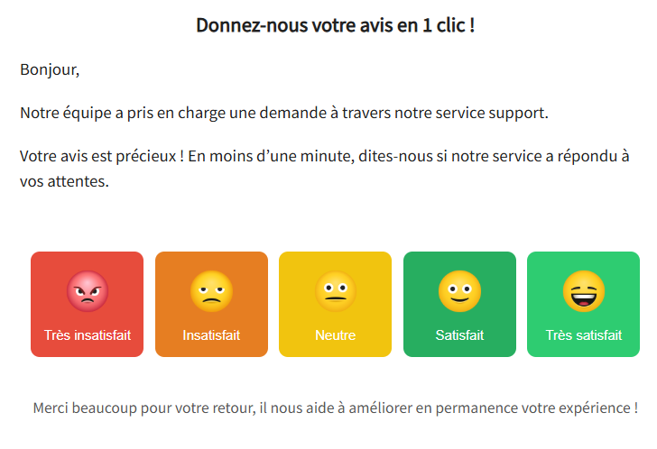 Dans Koban, dès qu’un ticket est clôturé, le client reçoit immédiatement une enquête de satisfaction. Les résultats sont affichés en dashboards et alertes pour suivre les clients insatisfaits.