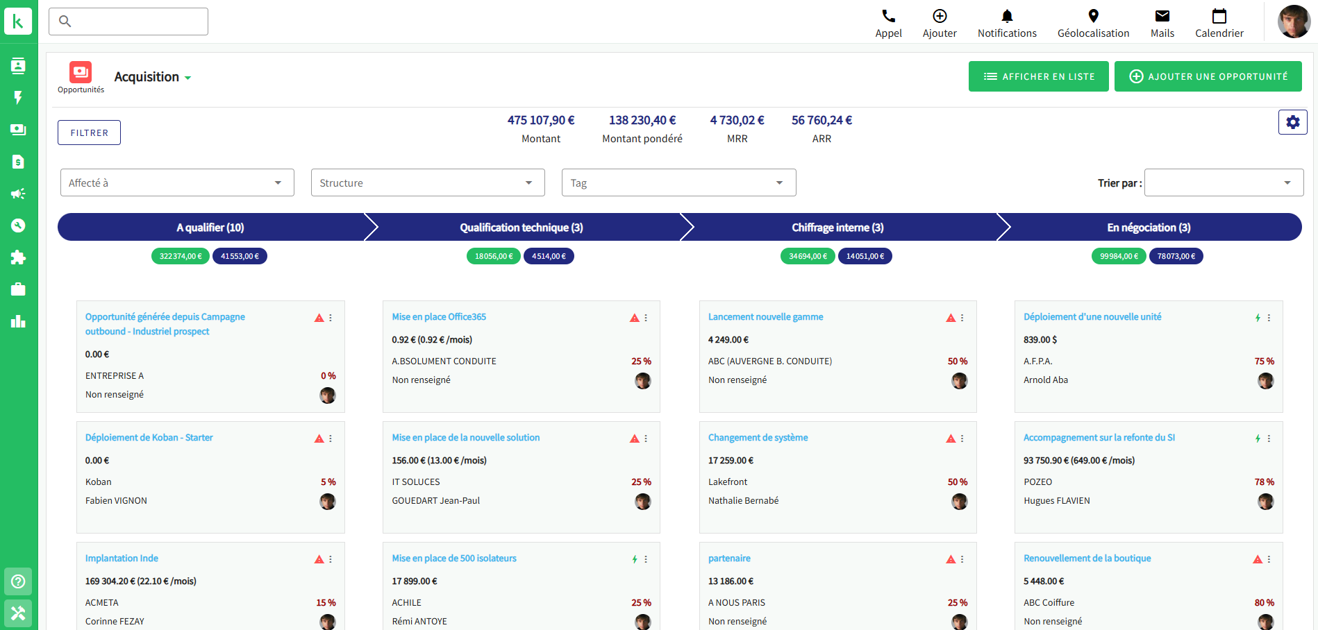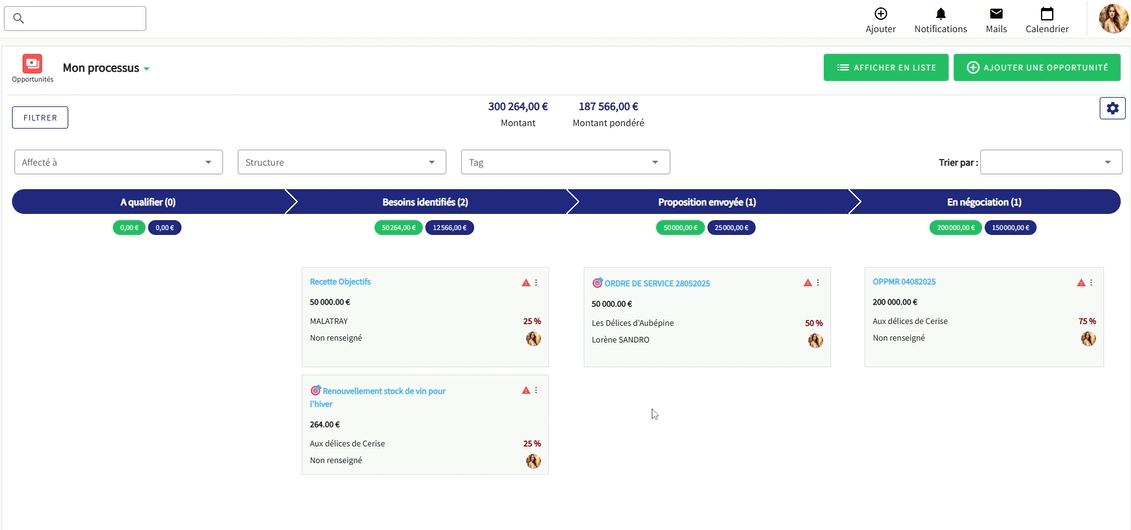 - Le pipeline de ventes, pour visualiser les opportunités en cours et leur avancement